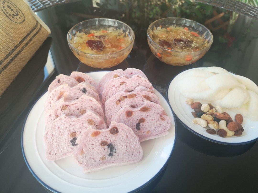 紫薯软欧包、桃胶皂角米银耳羹、水果坚果😋
