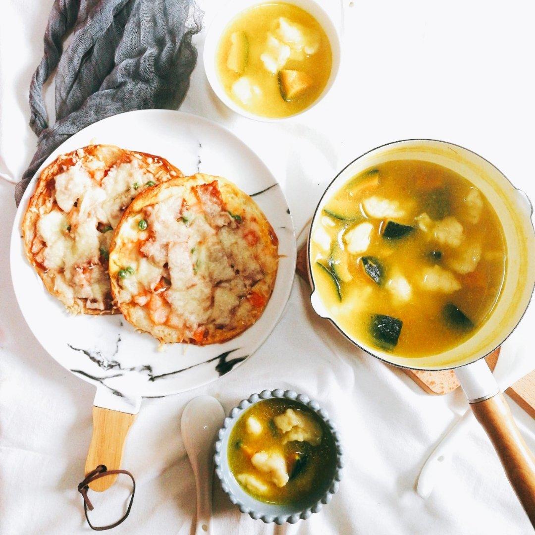 手抓饼披萨得到了某人的肯定,哈哈哈,在我小的时候我外婆有时会做的南瓜疙瘩汤当主食,选用的...