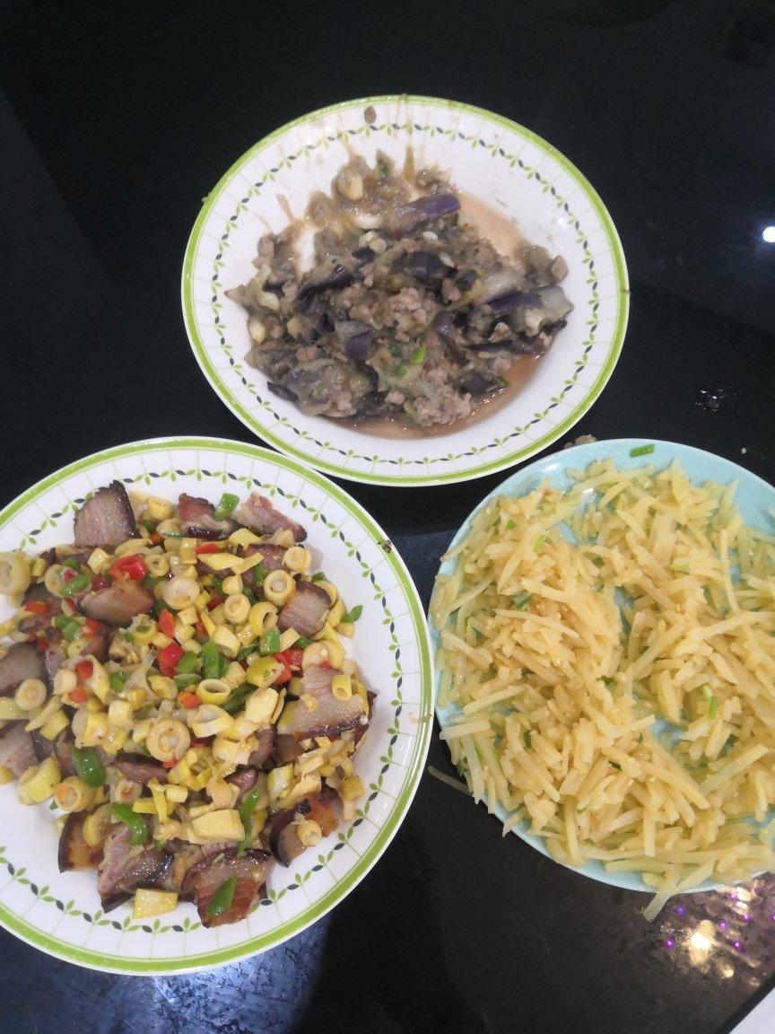 鲜笋炒腊肉、茄子肉末、土豆丝。吃了一半才想起拍照