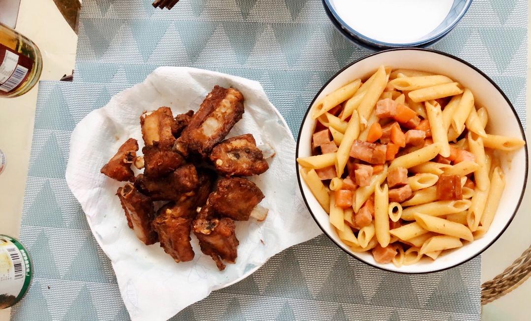 黑椒汁炒意大利面,里面切了些香肠、蒜苗、油渍番茄,黑椒汁是昨天做黑椒猪排的时候特意留下来的,待会有时间我把菜谱写出来。