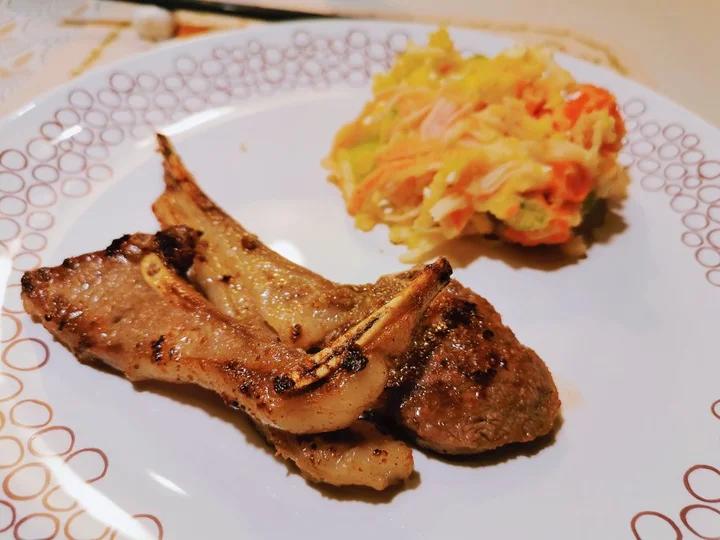 搭配小羊排的晚餐,土豆泥里加了蟹柳,黄瓜,鸡蛋,胡萝卜,土豆鸡蛋和胡萝卜一起...