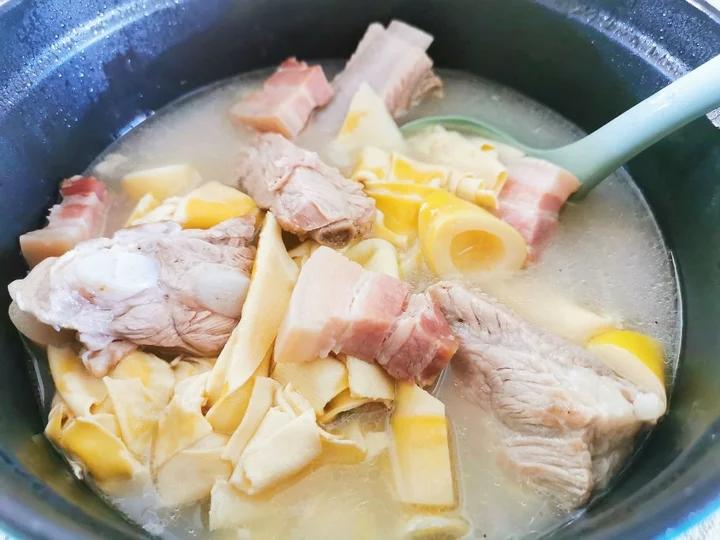 咸肉和排骨焯水后,锅里加点油,先把肉煸炒一下出油,再加开水煮,据说这样汤会比较...