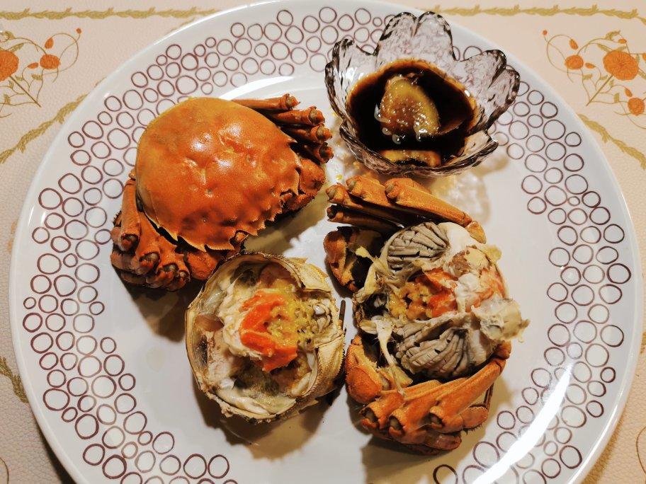 怕寒,蒸螃蟹的水里放了姜,螃蟹肚子上也放了姜片一起蒸。蒸完把姜片放到蟹醋里,又加了一点...