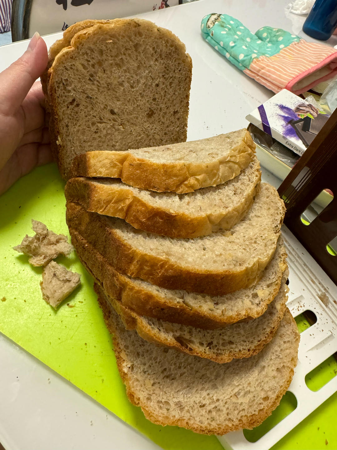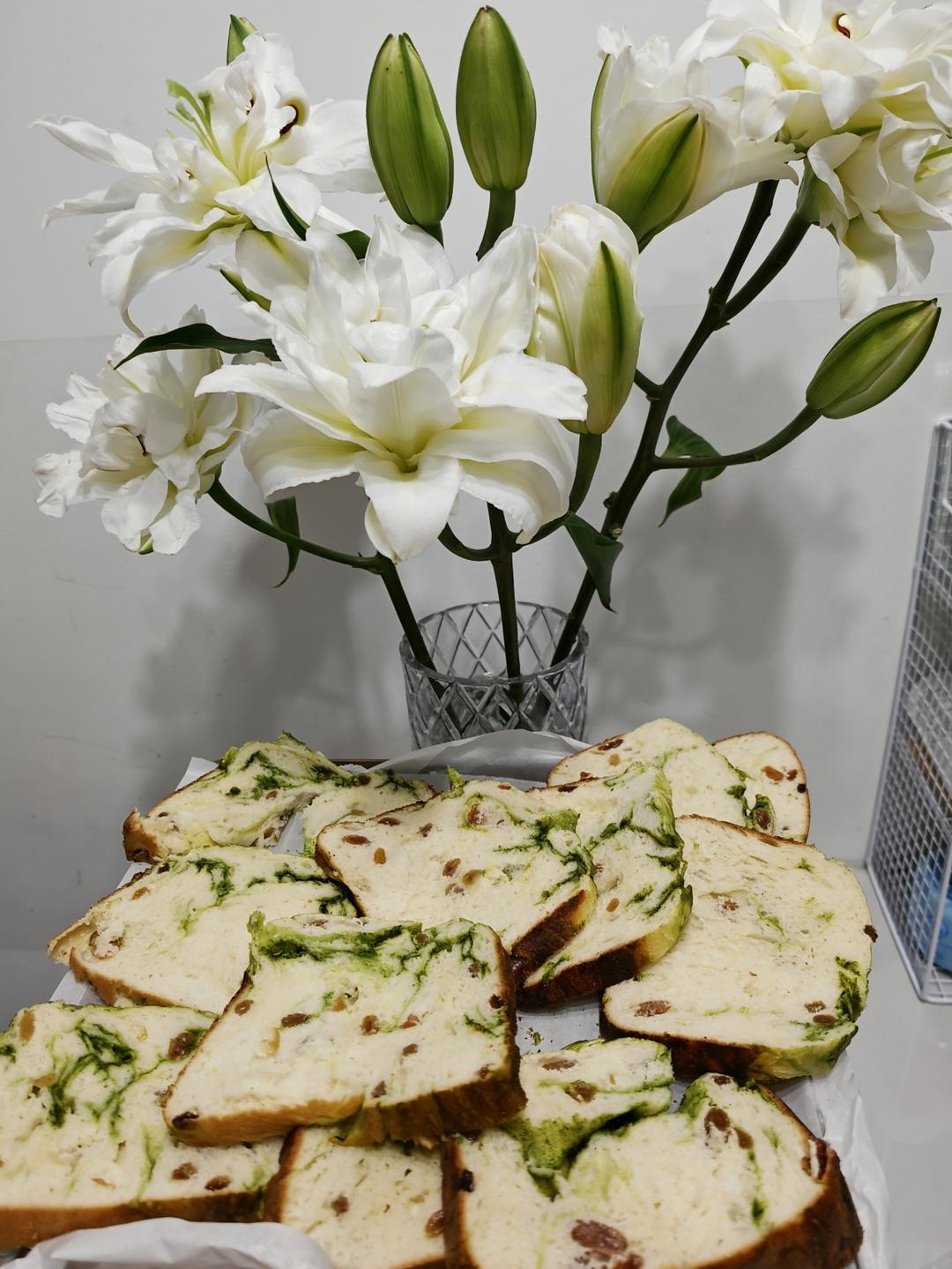 面包机带的方子,非常给力,最近做了很多次,今晚加了开心果酱。图片后几张,是前两天没加开...