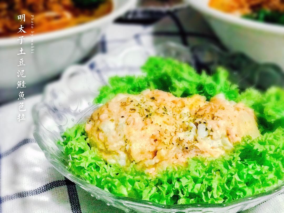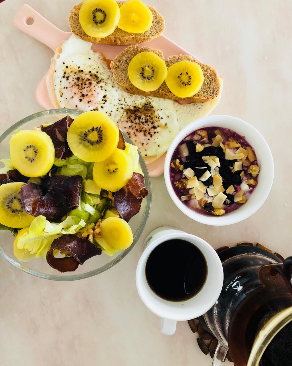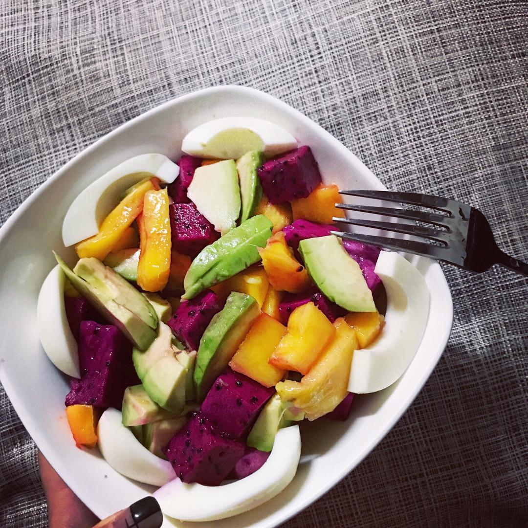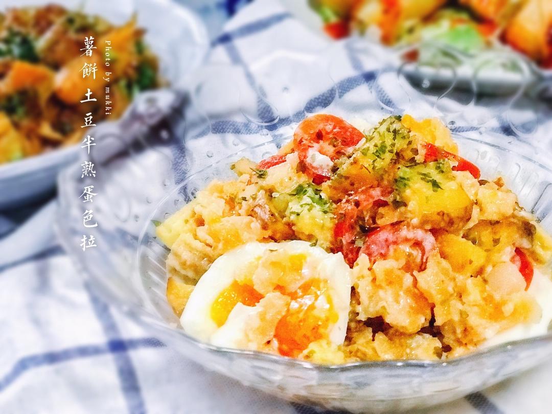 主要是薯饼煎熟后戳碎加入烘烤切块的带皮土豆丁拌上番茄和玉米笋外加一个半熟蛋的色拉~