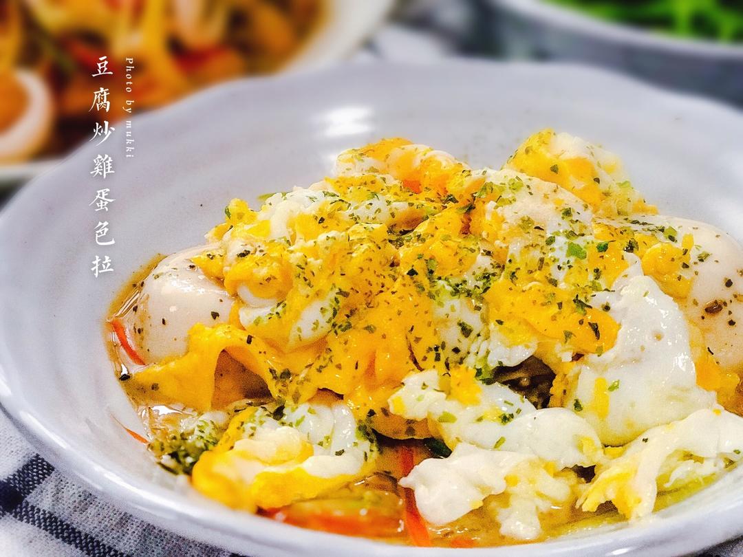传统的豆腐蔬菜色拉上面盖上热炒的鸡蛋!配合一起吃哟~冷热一起~棒棒哒w #晚餐•2018年6月27...
