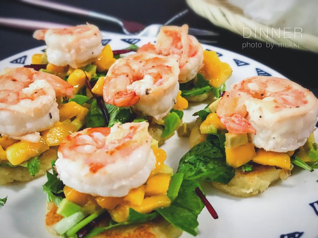 土豆玉米粗粮饼 配芒果&牛油果大虾色拉!