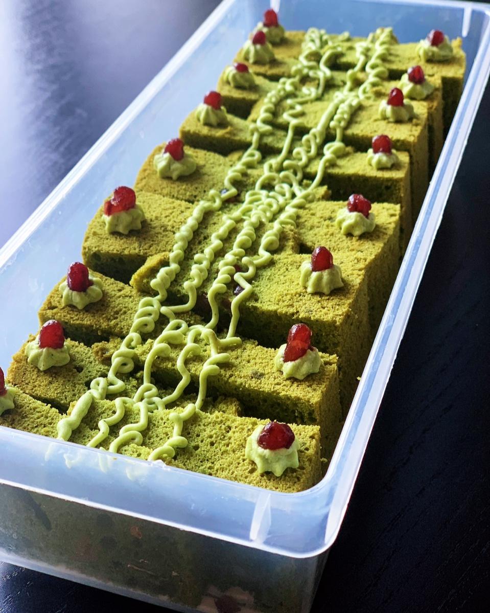 抹茶蜜豆戚风盒子蛋糕,配了抹茶慕斯琳奶油霜和蜜红豆。