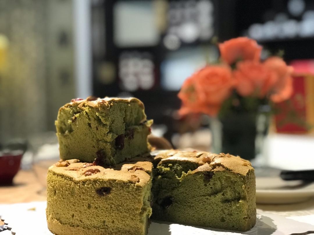 抹茶戚风蛋糕,越做越好啦!加入核桃仁和美国带回来的有机蔓越莓果干👍