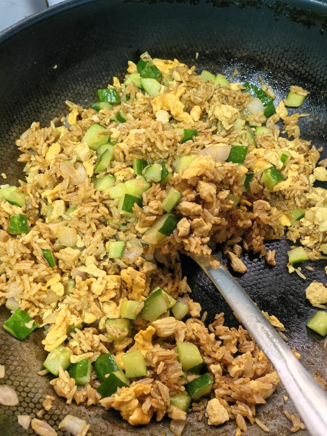 顺序稍微有点不同,青瓜先炒放着,鸡蛋先炒放着,鸡肉和咖喱一起炒,然后在鸡肉放着,最后化开一个咖喱加饭一起炒,再把其他配料...