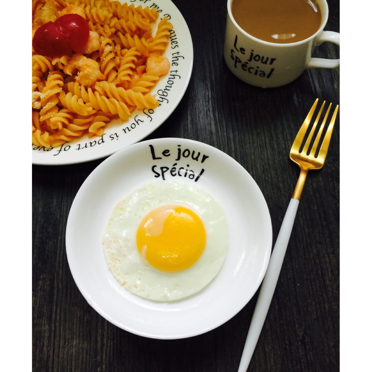虾仁茄汁意面+太阳蛋+牛奶咖啡