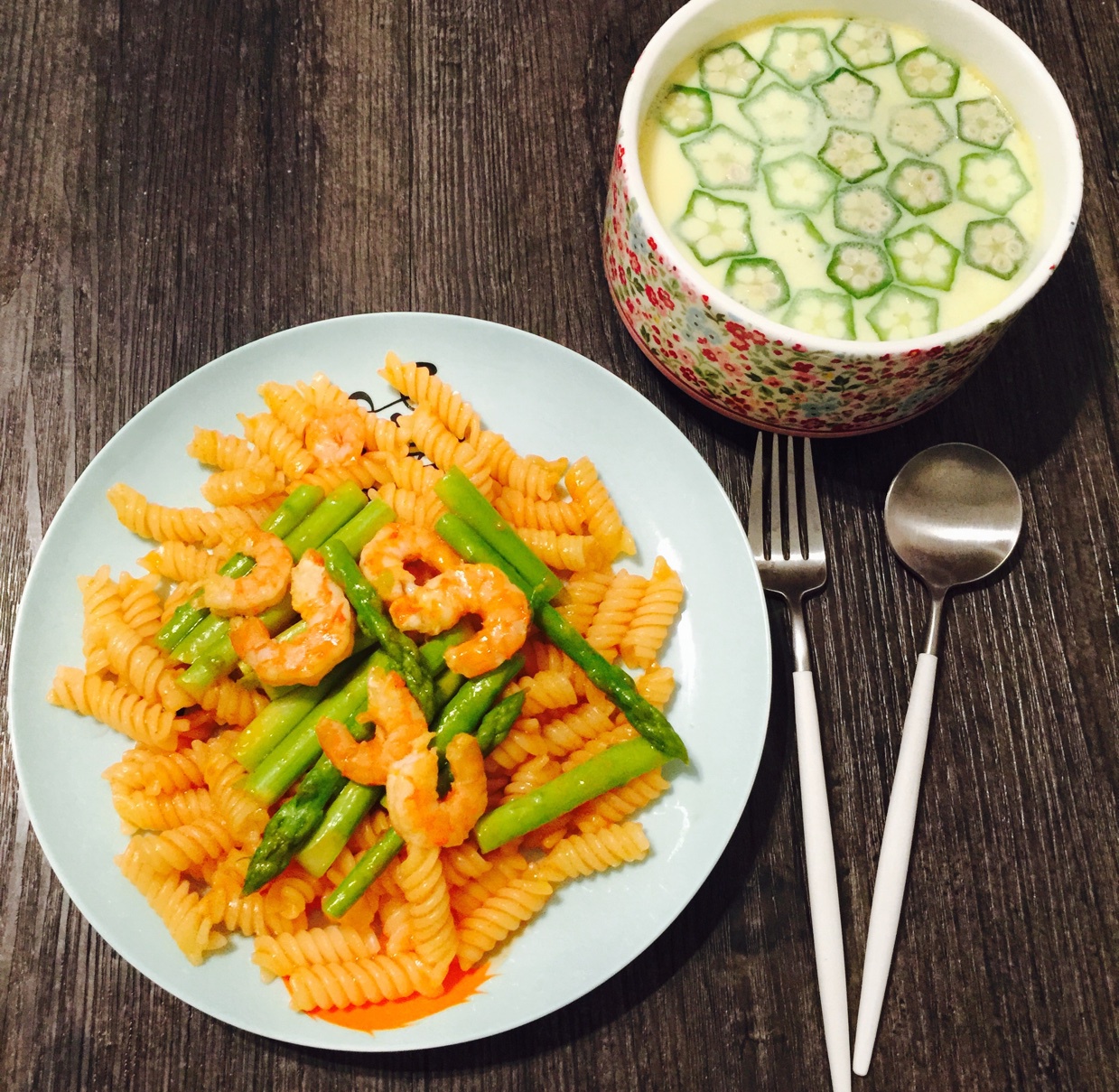 芦笋鲜虾意面+秋葵蒸蛋