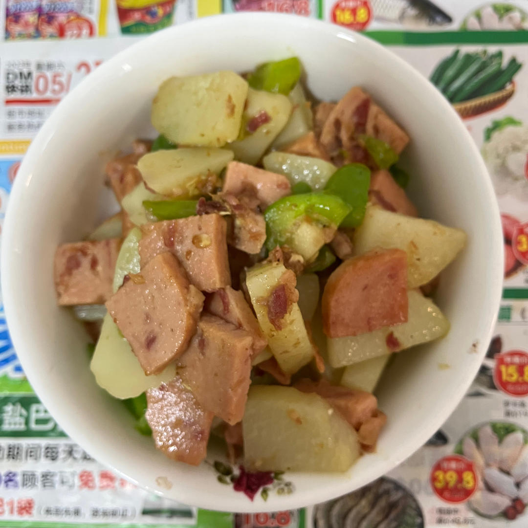 土豆洗净切成四块,加水煮15-20分钟,捞起撕皮,切块。午餐肉取半罐,切片...