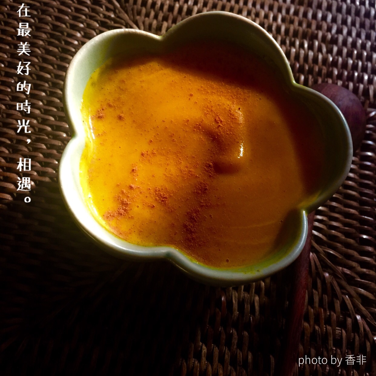 昨天加班,为了拍这碗南瓜露,急急收工赶回家,才把架式摆好,2分钟太阳就下山了,心里本来想练练拉花,结果一个大丽花也没拉出...