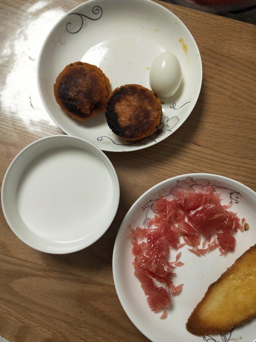 南瓜糯米饼,煮蛋,法式奶香片,牛奶,红柚。
