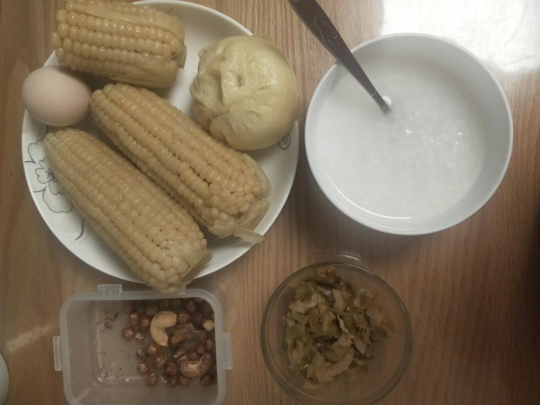 包子,玉米,煮蛋,大米粥。