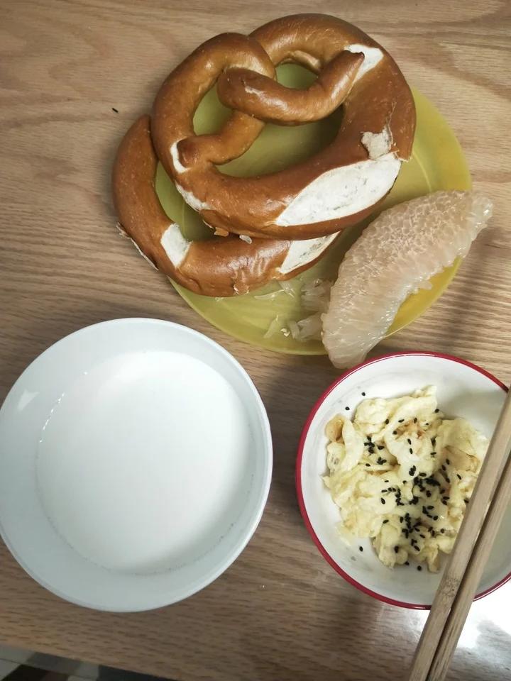 山姆的咸面包,炒蛋,牛奶,柚子。