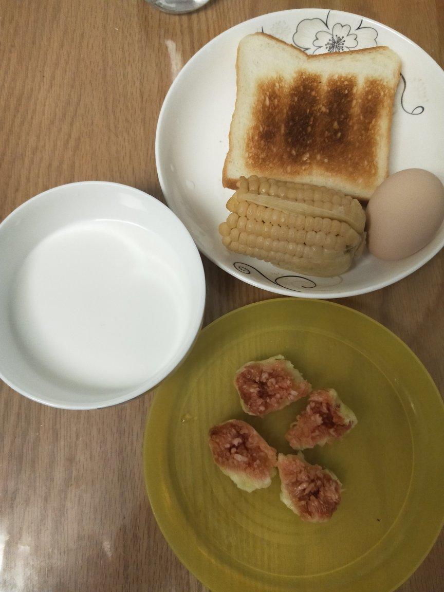 烤土司片,抹了一丢丢蜂蜜,玉米,煮蛋,牛奶,无花果。用时5分钟。