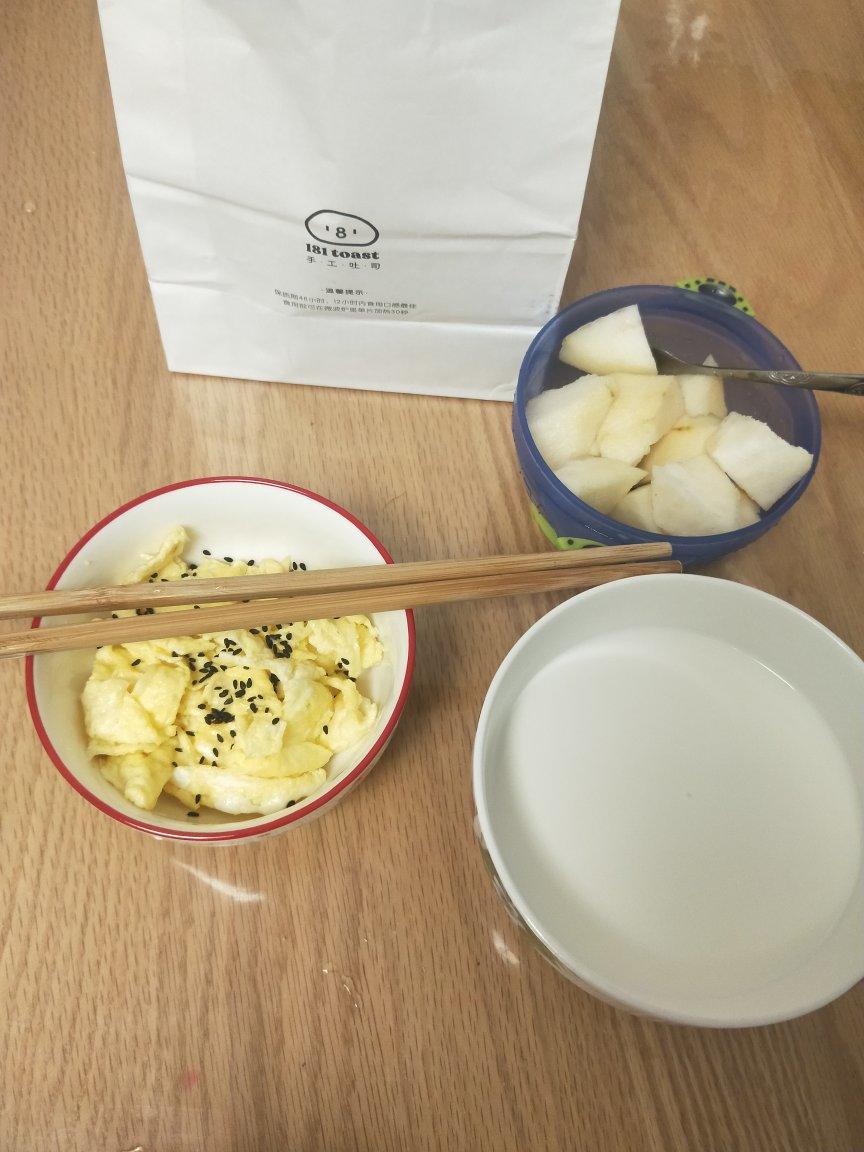 土司切片,炒蛋,牛奶,梨。用时10分钟