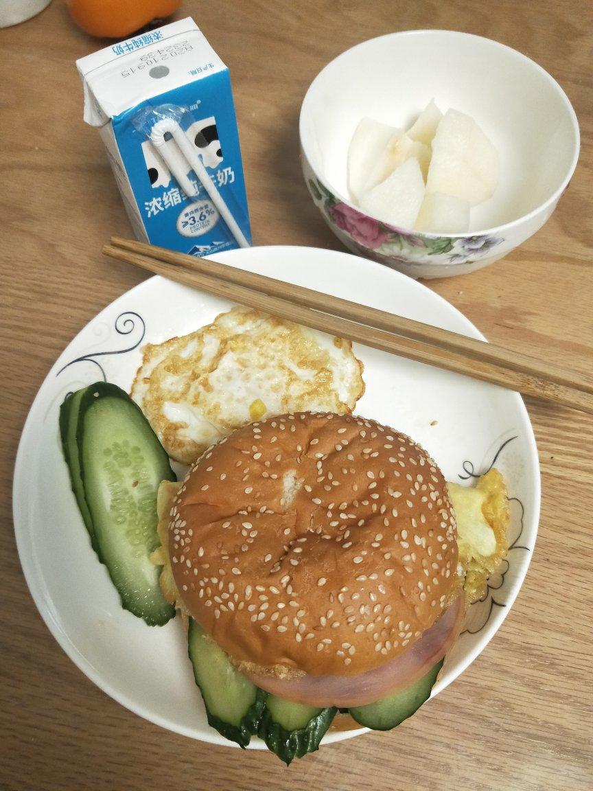 汉堡,梨,牛奶。用时15分钟(汉堡做了三人份)。