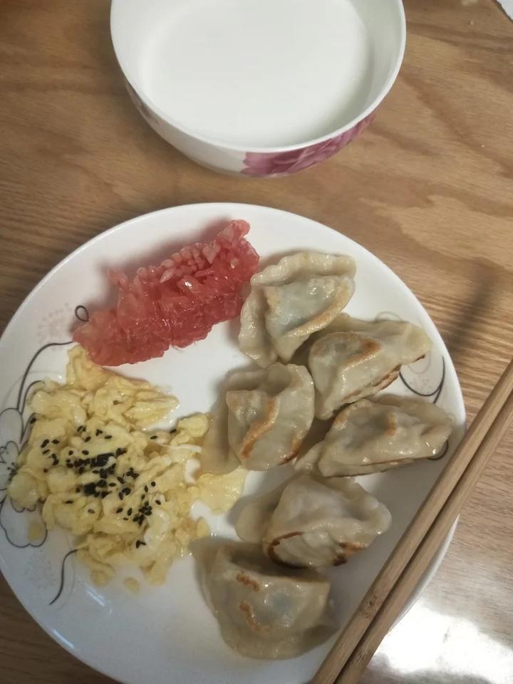 煎饺,炒蛋,红柚,牛奶。用时10分钟