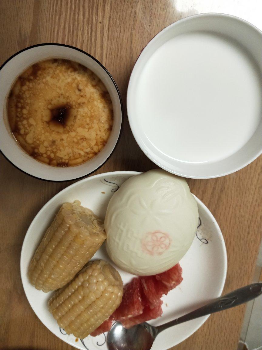 山东大饽饽,玉米,蛋羹,红柚,牛奶。