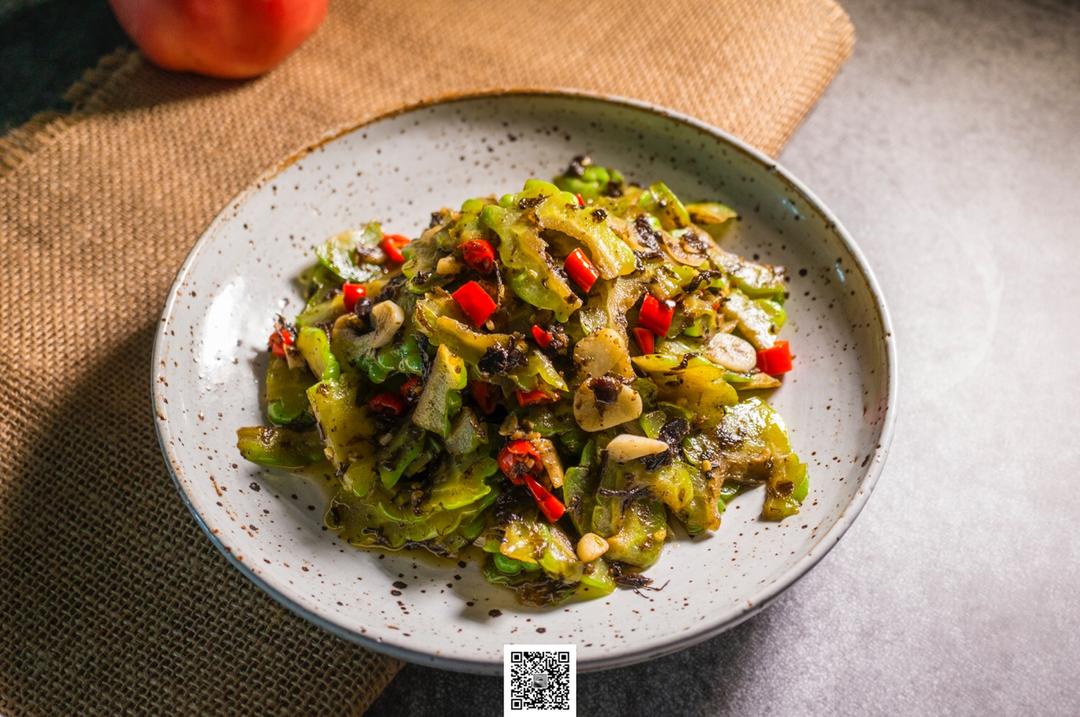 简罡私房菜《榄菜炒苦瓜》:这是一款典型的粤菜,榄菜不仅能炒四季豆,炒苦瓜也是酷夏的首选。