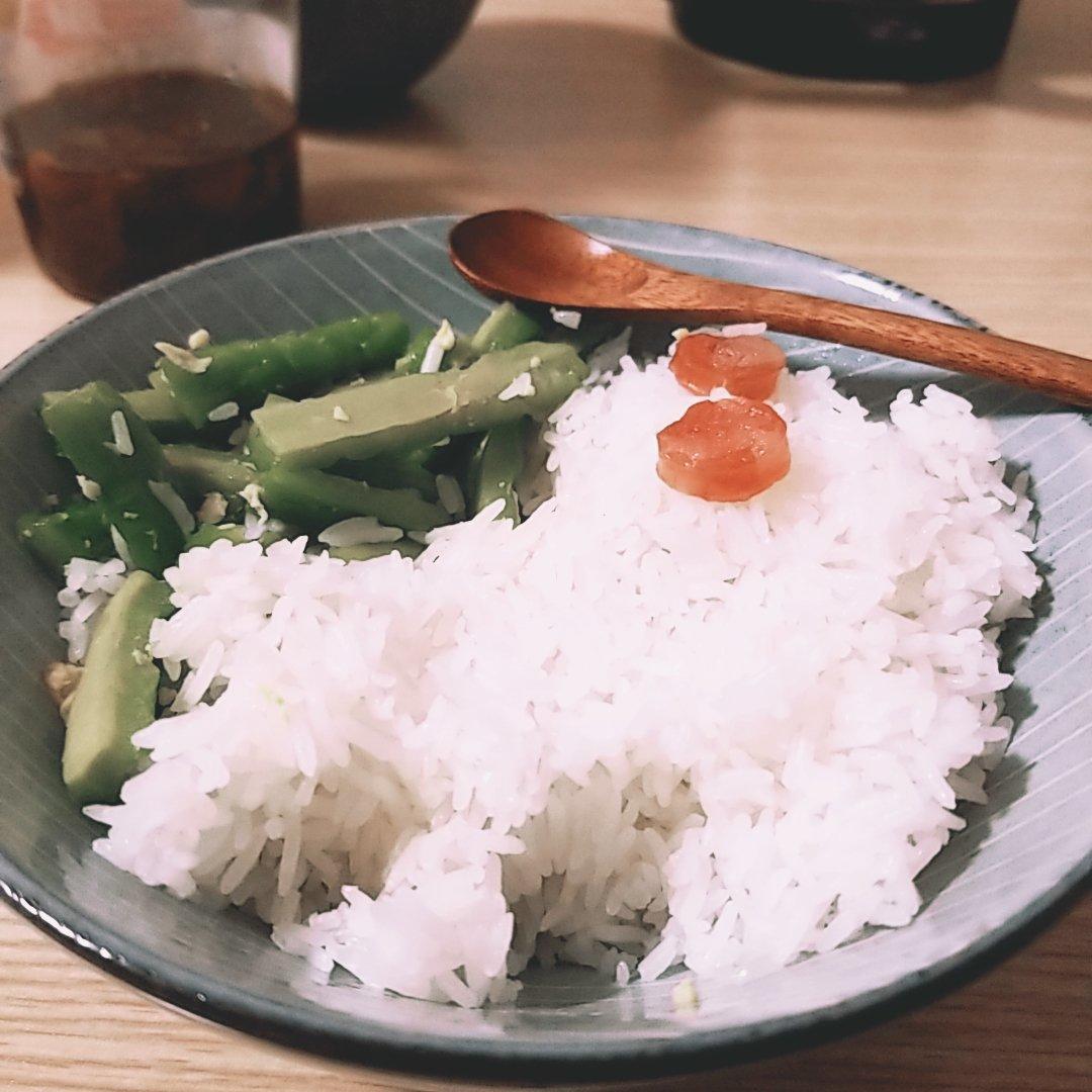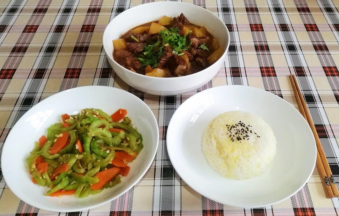 凉拌苦瓜,二米饭,红烧牛肉,加了一个土豆。孩子表示土豆加少了😛