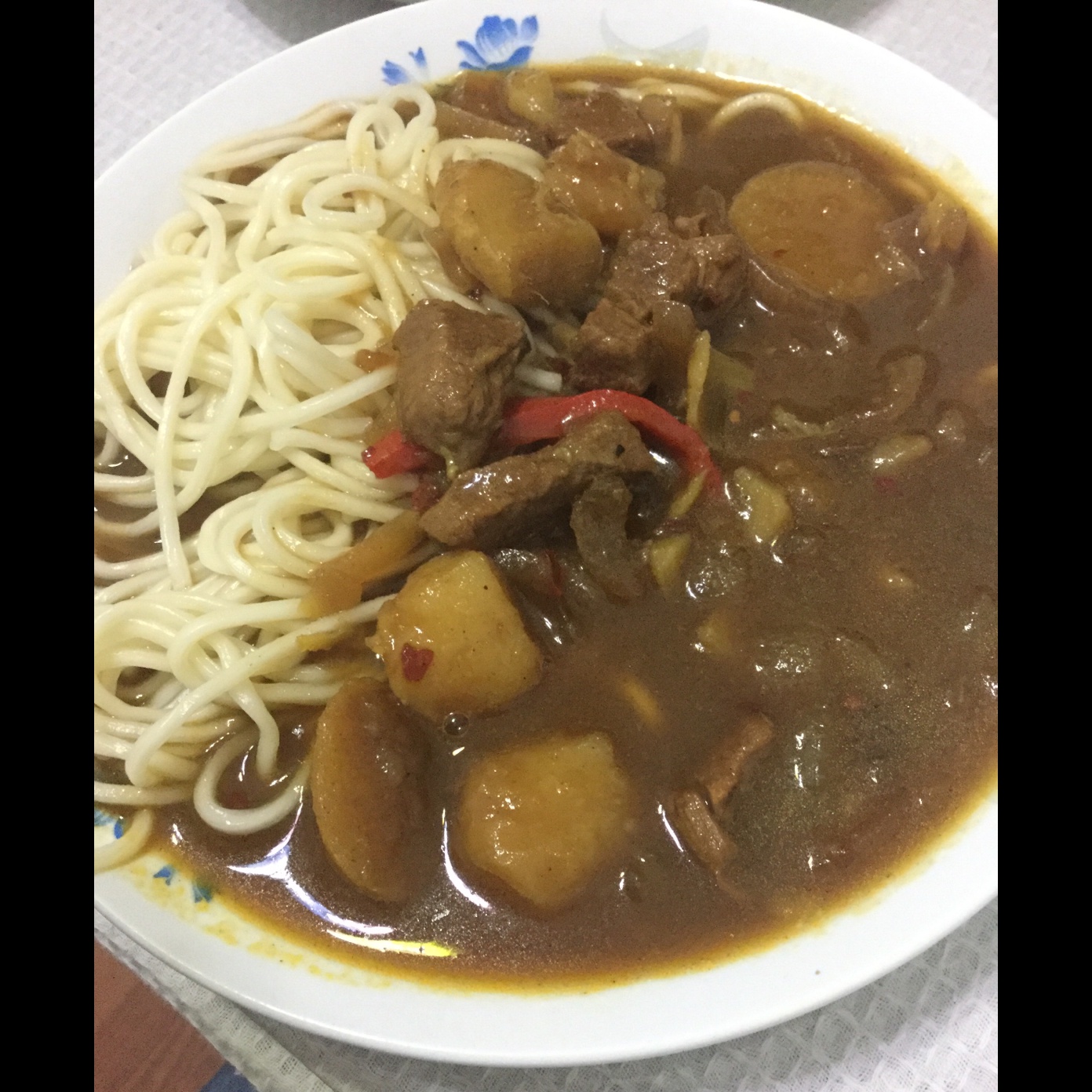 看着就很有食欲,吃着也不错。咖喱本身不太辣,又加了黑胡椒粉和一勺老干妈,很合自己口味,家人都说好