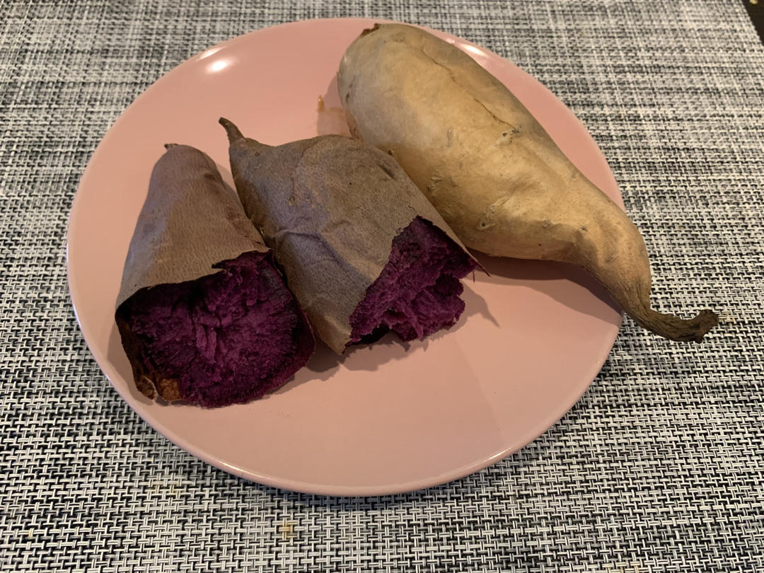 今日小午餐:烤小紫薯,小红薯,外加两个水煮蛋