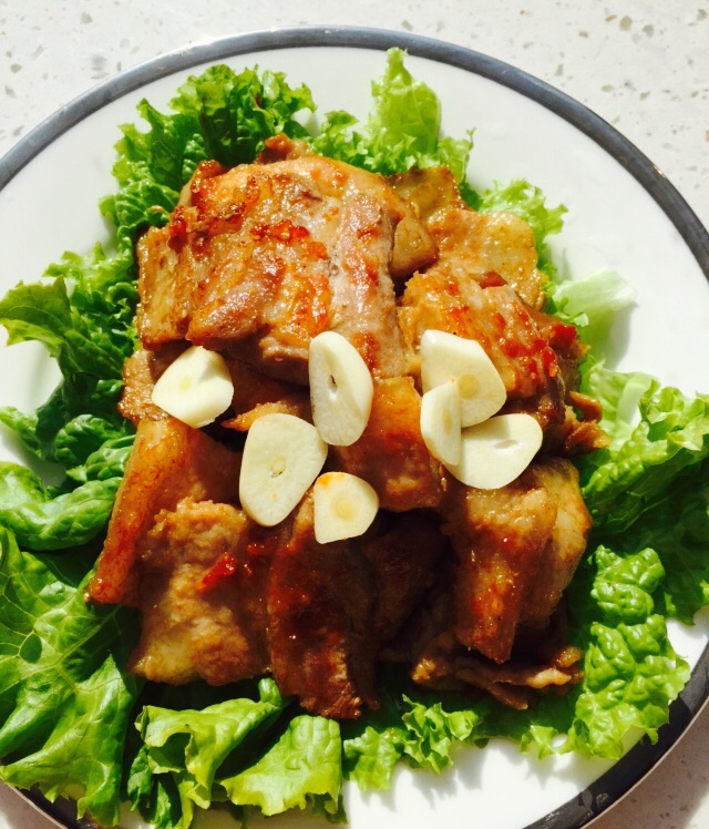 秘制煎肉,料酒'海鲜生抽,蚝油,腌制一上午,文火煎熟,刷朝鲜辣酱略煎,出锅摆盘' #午餐•2015年10...