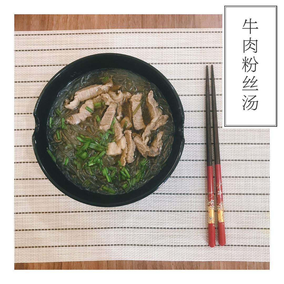 用的冻牛排切的生牛肉,开水加葱姜料酒烫熟后留汤底煮粉丝,很鲜美!