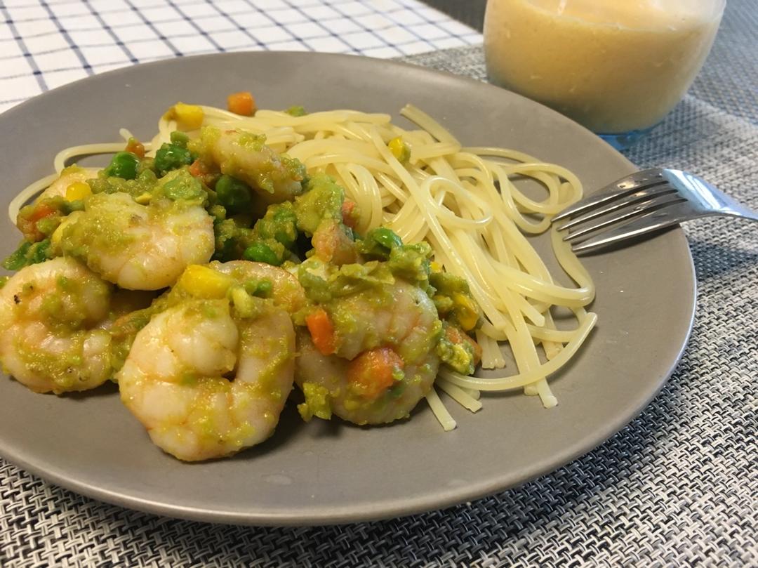 早餐 牛油果虾仁意面🍝🍤🥑 再配一杯木瓜奶昔