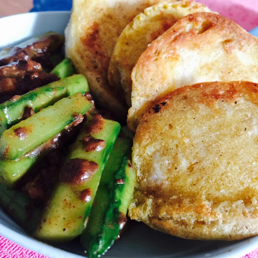 煎馒头片配清爽小菜,绝配。周末的早上,用味道清醒阴霾的一天。