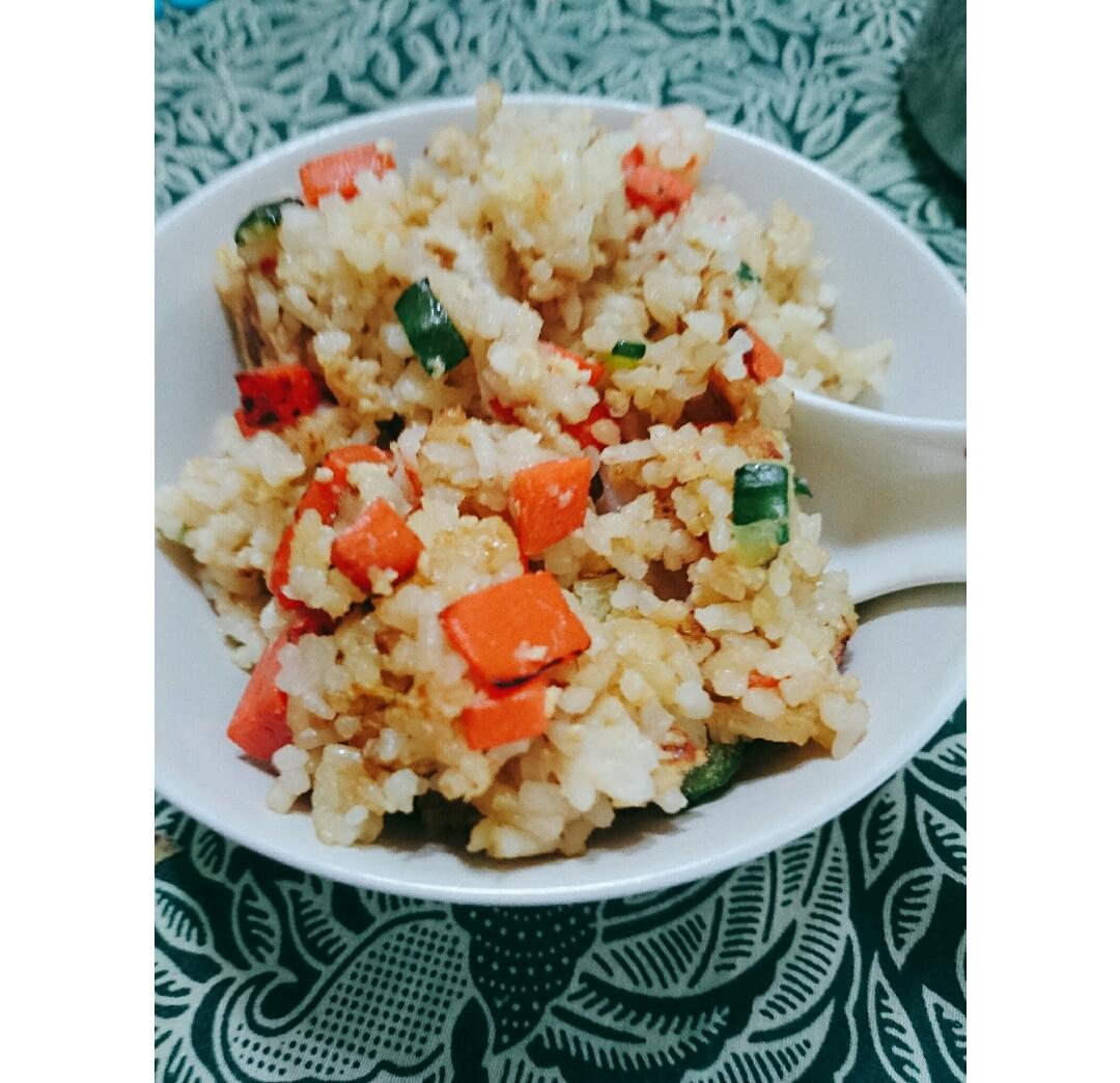 蛋炒饭,加了点青瓜胡萝卜虾仁。下次丁再切小点吧٩( ᐛ )( ᐖ )۶ 妹妹和小狼说好吃