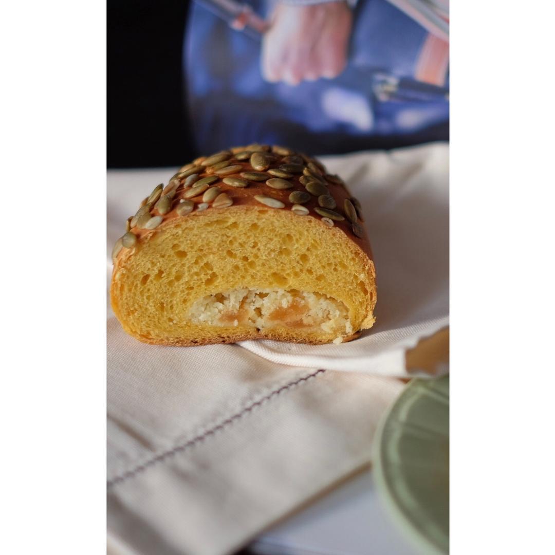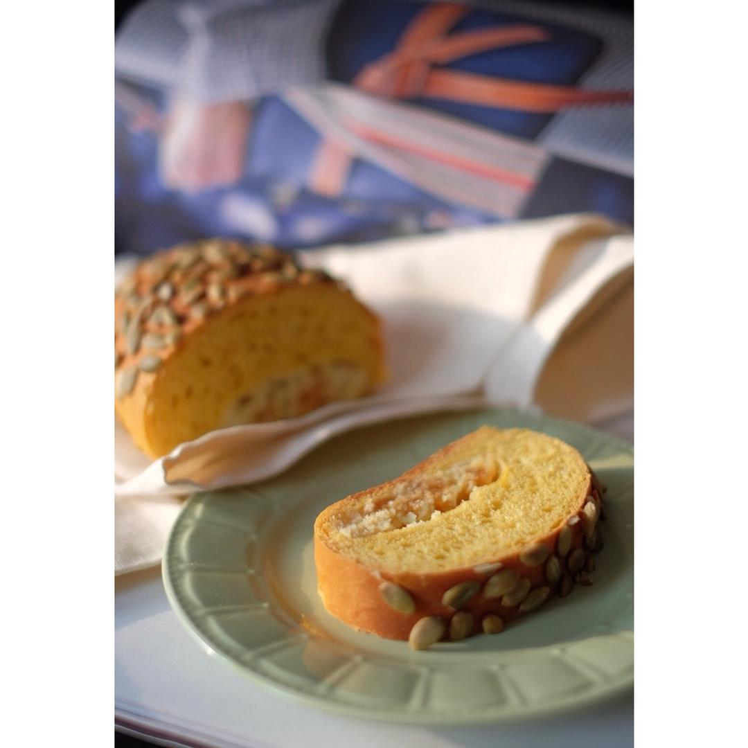 全麦南瓜面包 ~ 没有酵种就用了酵母粉,230克高粉+30克全麦粉,南瓜泥多了一些,就相应减少了鸡蛋和牛奶的液体量。不夹...