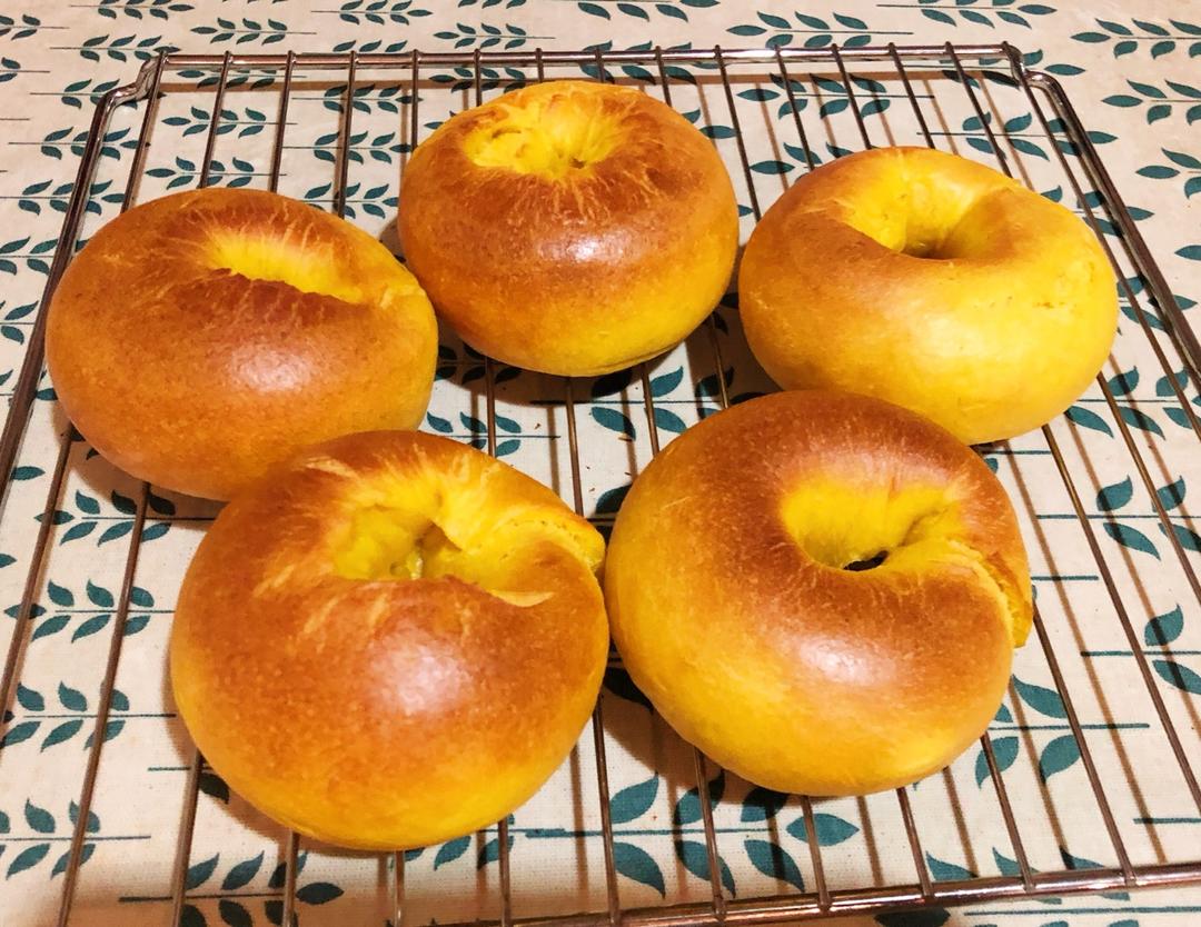 南瓜贝果~非减肥版(有点糖也有点油😜)最可笑的煮贝果的糖水忘记加糖😂,捞出贝果摆好了一扭头发现一小碟白砂糖还在旁边放的好...