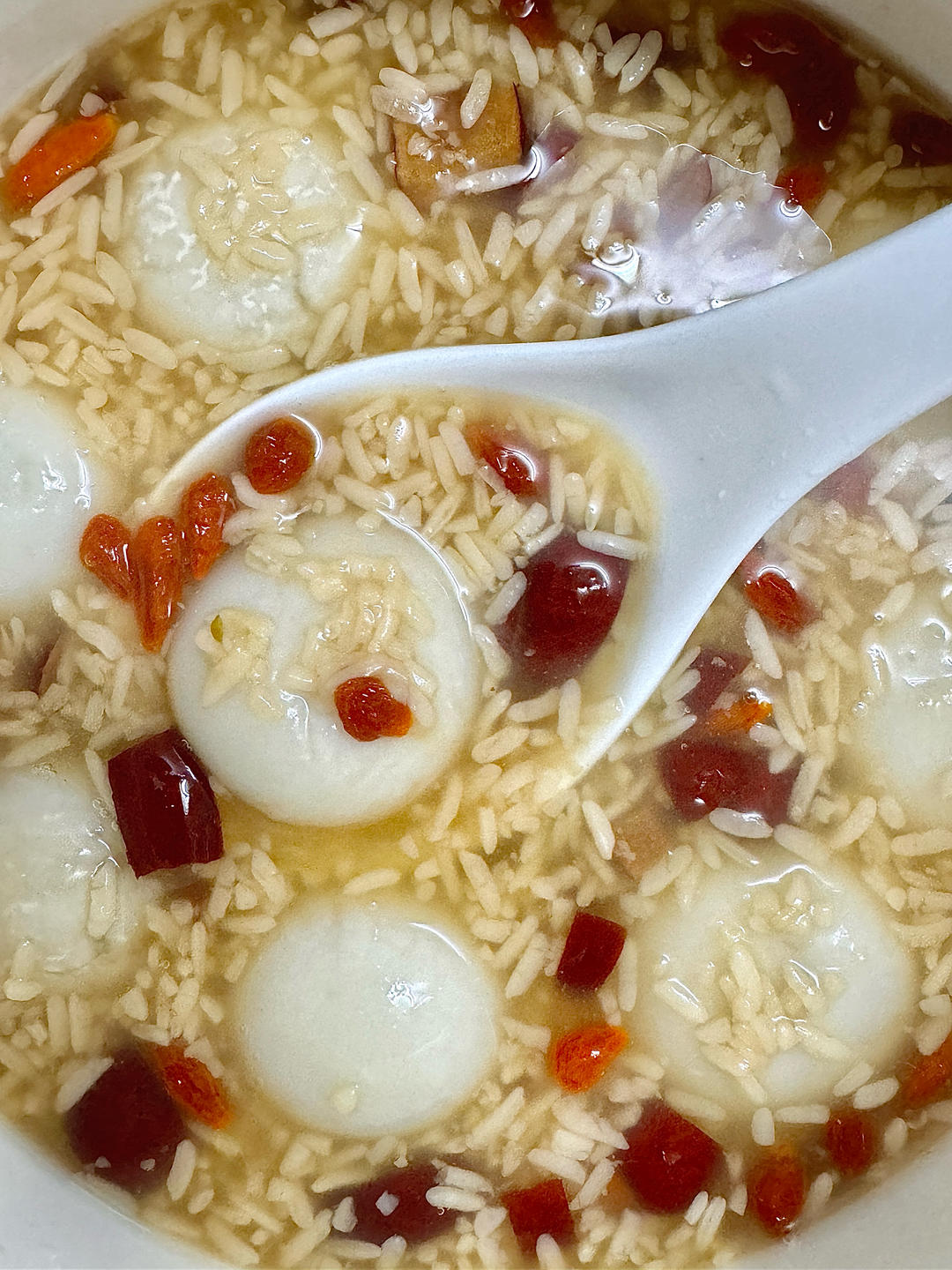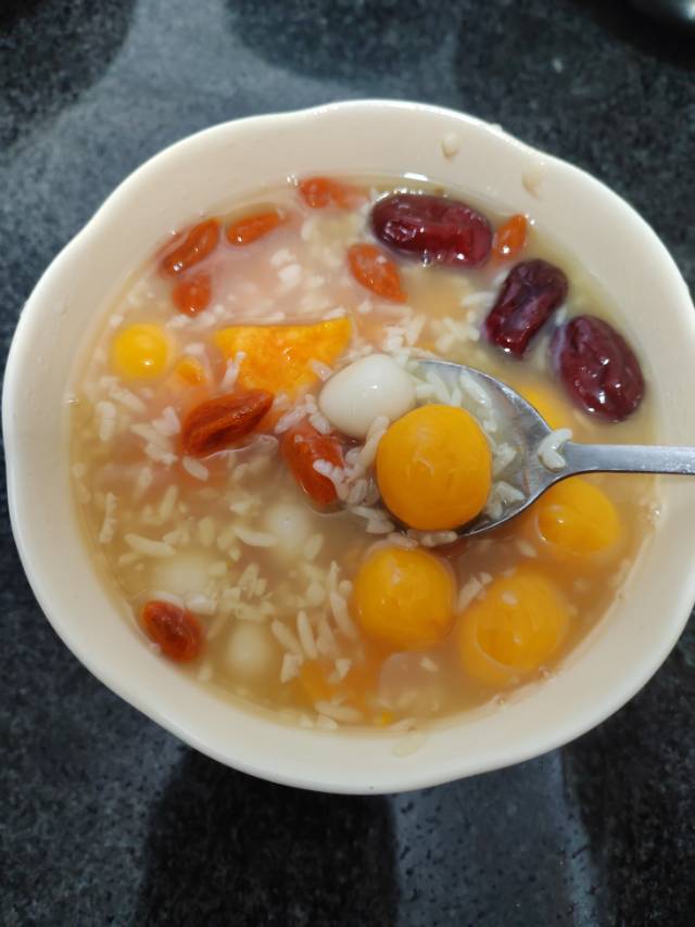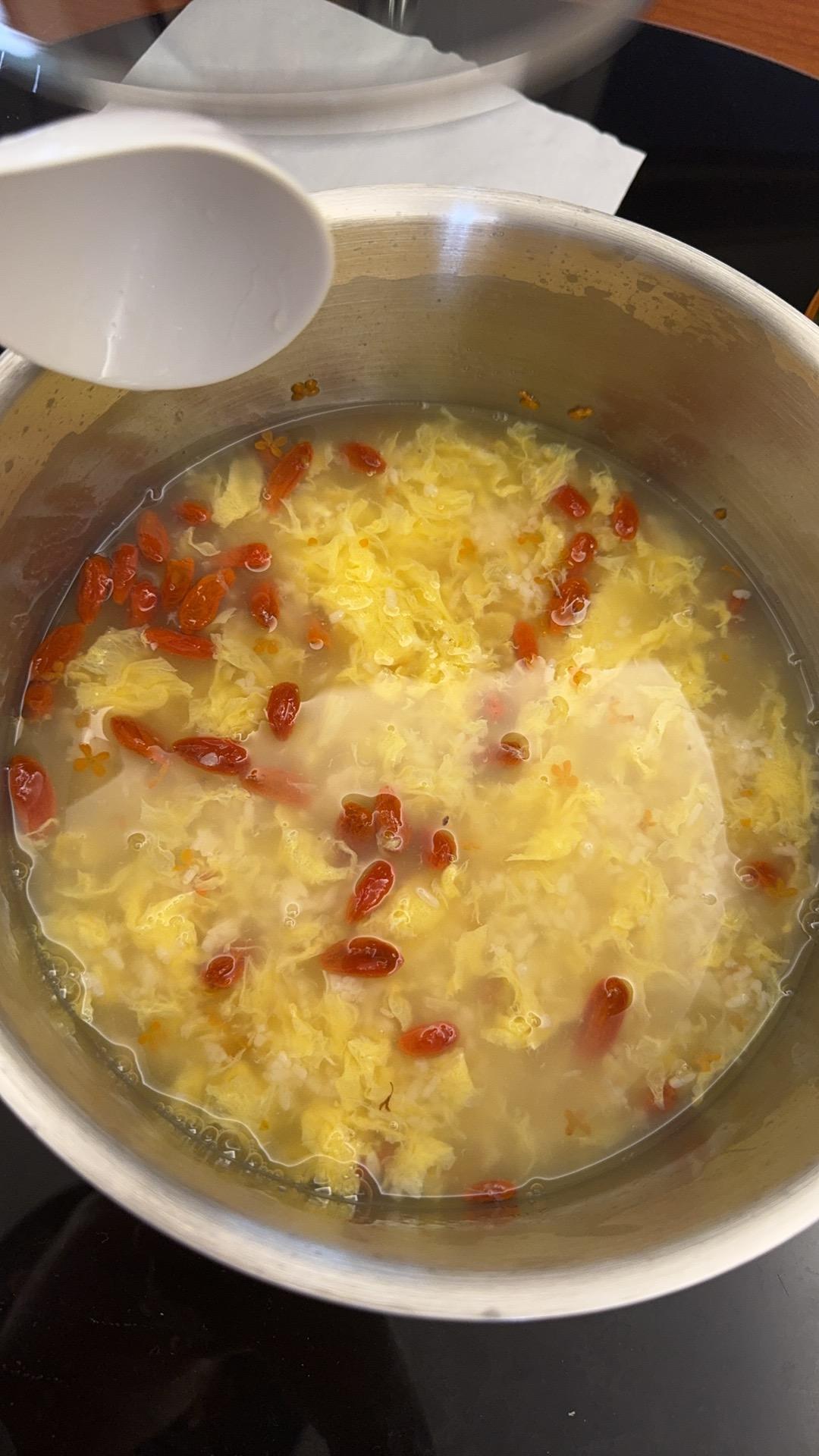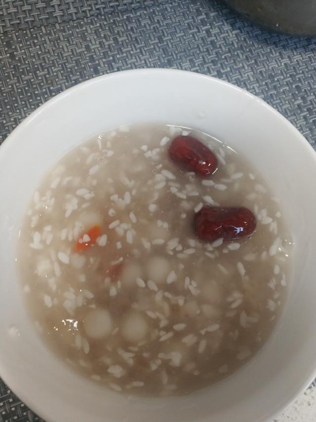 2.加入两勺甜白酒(酒酿)、枸杞、大枣