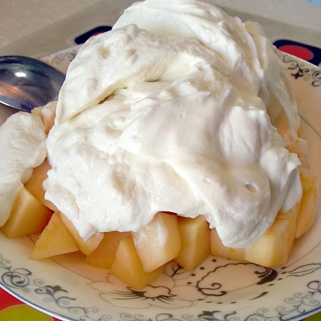 用的这个格梦顿稀奶油,不是太好打发,最后也比较软。上次用雀巢的很好打发。