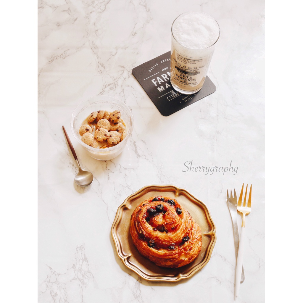早餐~ 提子可颂,奶泡咖啡和小曲奇麦片泡牛奶。