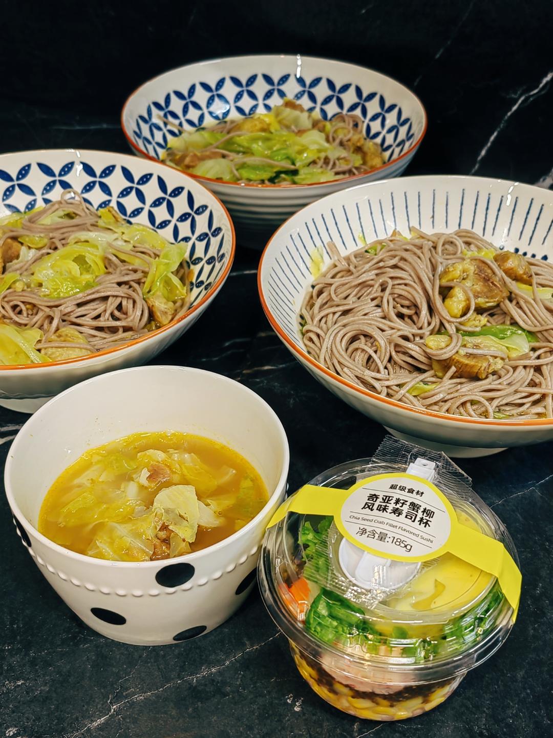 蛋白棒(没拍)+咖喱牛肉卷心菜汤+盒马寿司杯