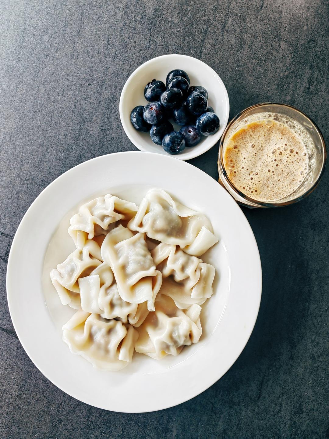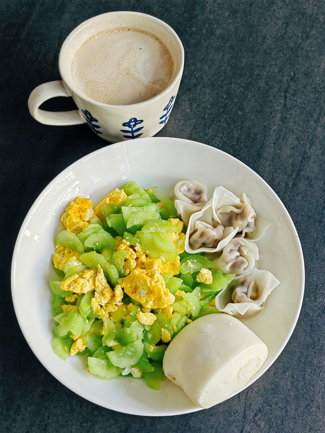 馒头+小馄饨+黄瓜炒蛋+拿铁