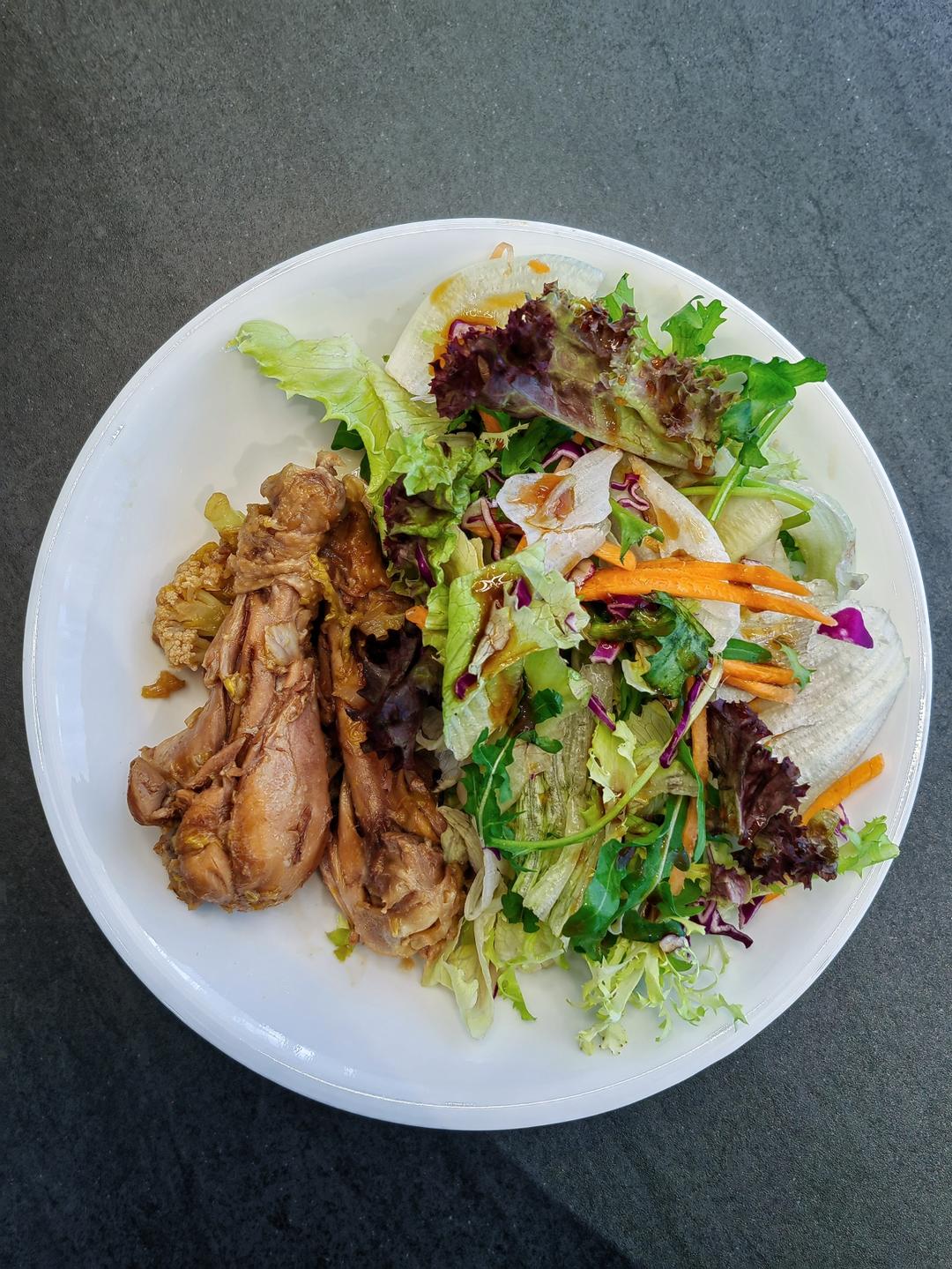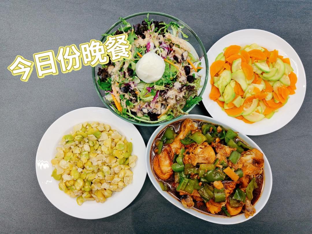 红烧鸡腿+胡萝卜西葫芦+沙拉+豆瓣