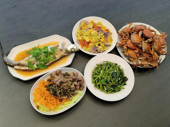 清蒸白水鱼+黄瓜胡萝卜拌牛肉片+蒜泥空心菜+清蒸螃蟹+彩椒洋葱炒鸡蛋