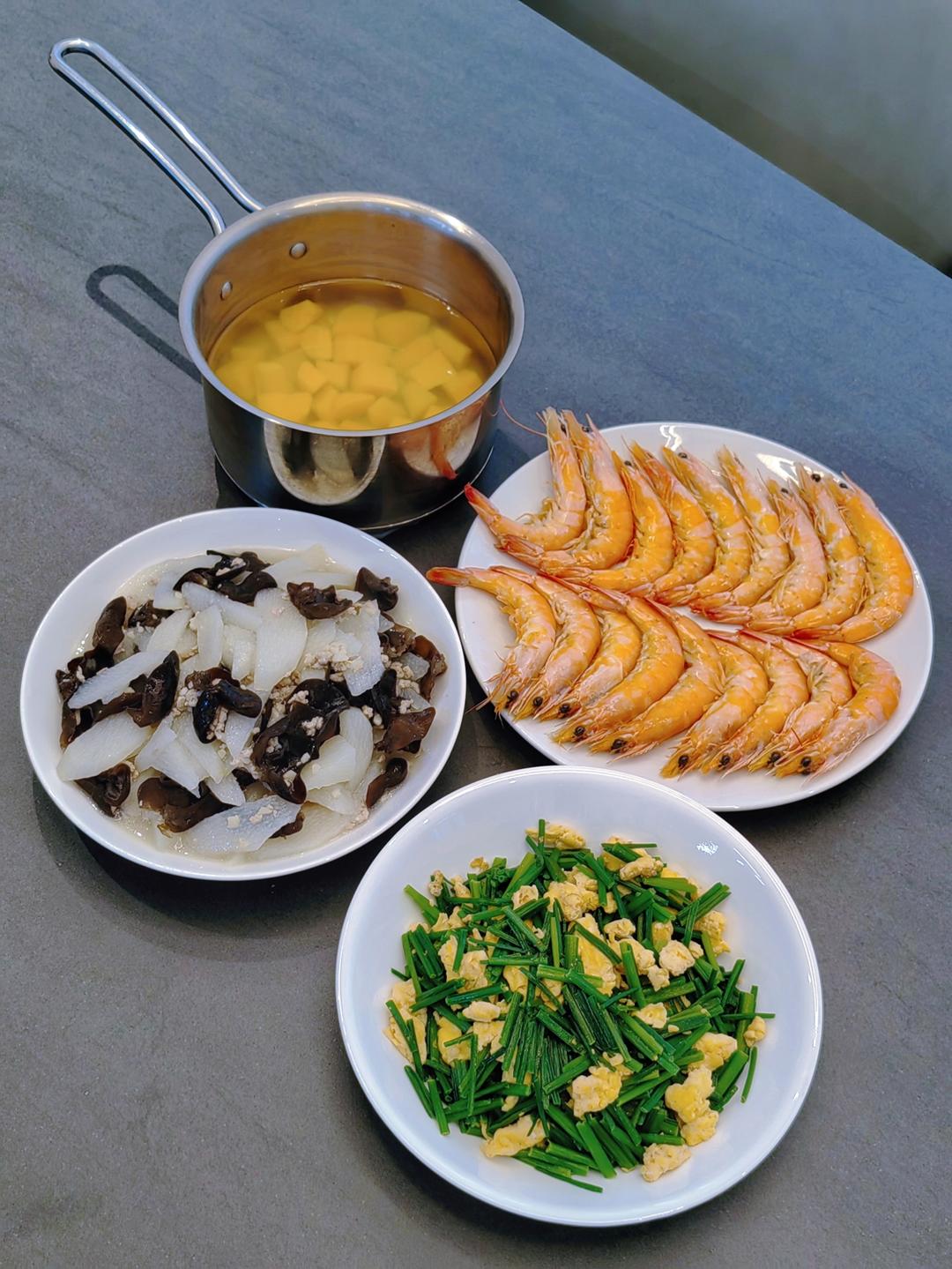 木耳肉末炒山药+韭菜花炒蛋+白对虾+红薯汤汤