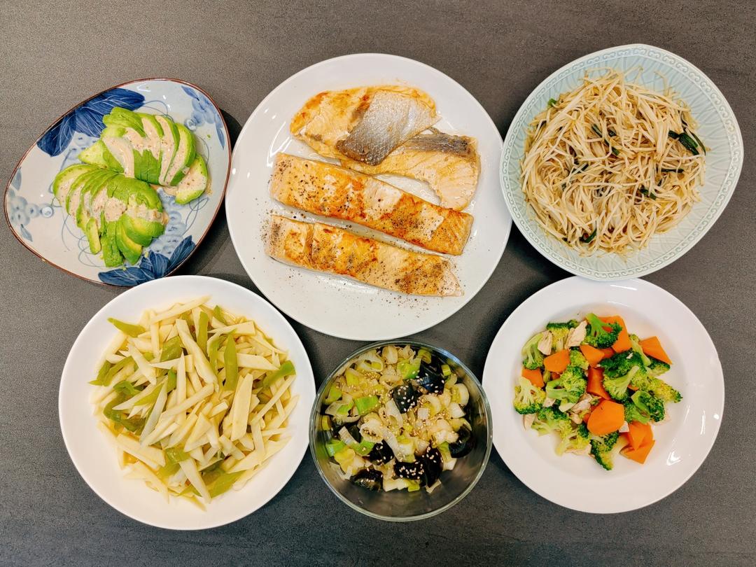 青椒茭白+大葱拌皮蛋+胡萝卜西兰花+炒绿豆芽+煎三文鱼+拌牛油果