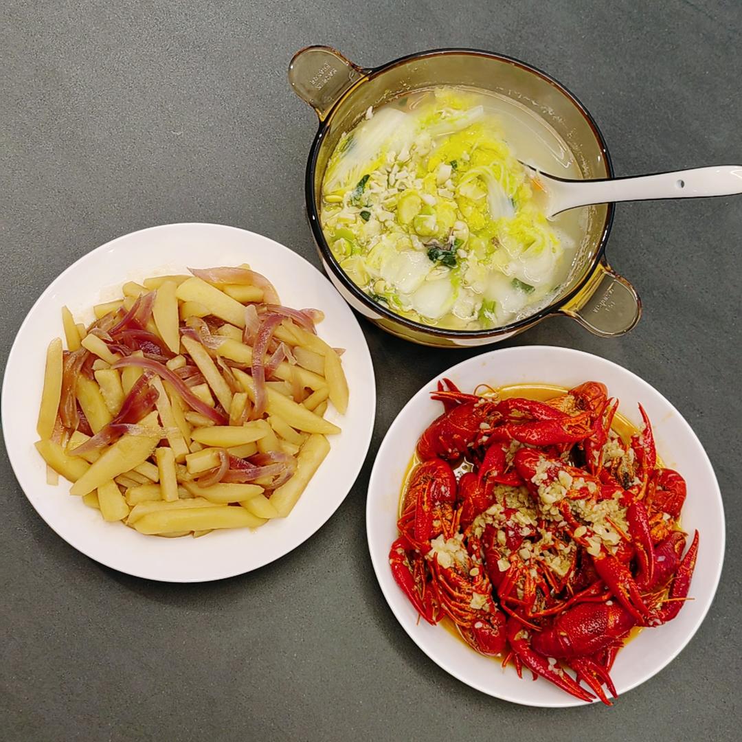 洋葱土豆+娃娃菜豆瓣汤+蒜蓉小龙虾