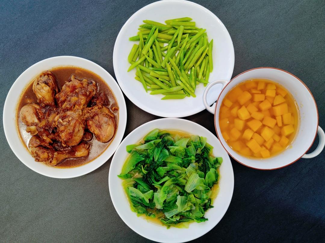 红烧鸡腿+蚝油生菜+清炒芦笋+煮红薯