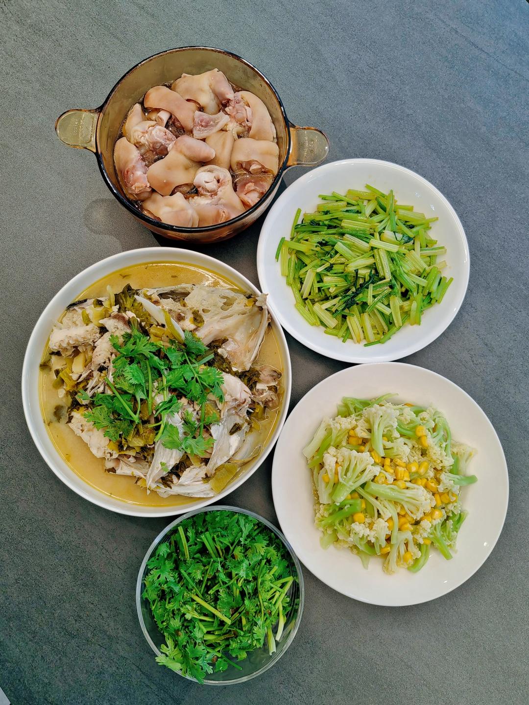 酸菜鱼头+花菜玉米粒+炒芹菜+糟猪爪