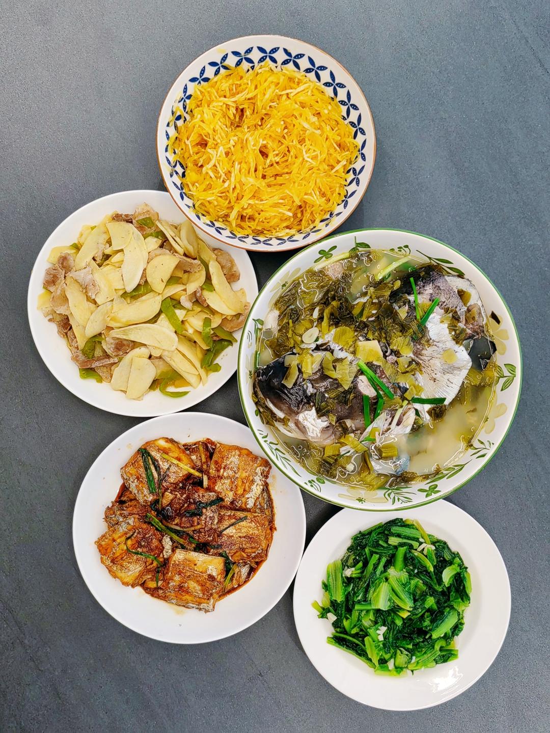 红烧带鱼+清炒油麦菜+酸菜鱼头+凉拌金瓜丝+青椒茭白炒五花肉
